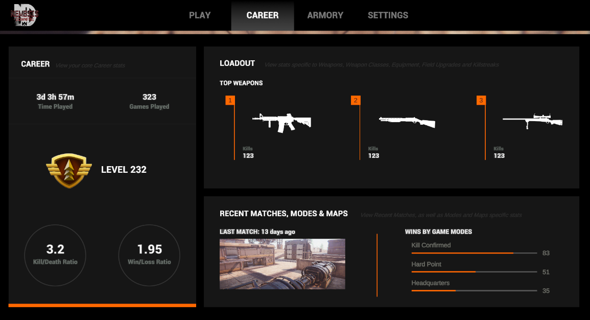 Once signed up for Nemesis Downfall, the player is able to access his career information in-game, featuring his most notable stats such as: